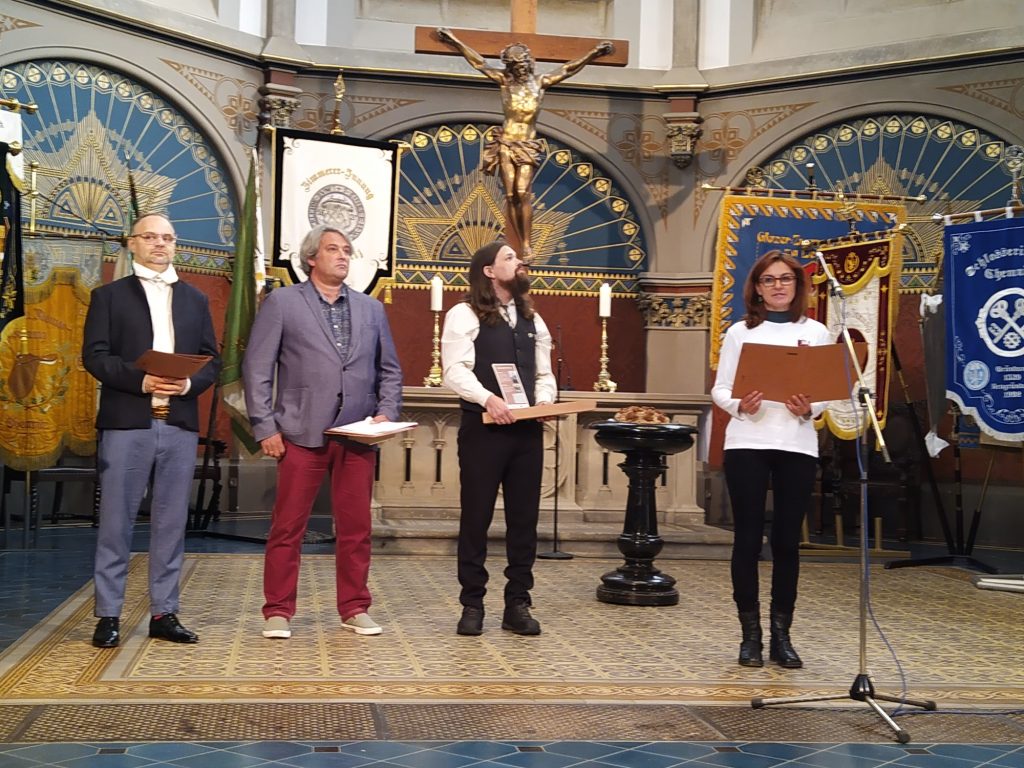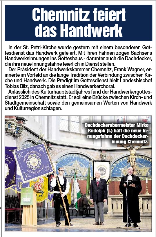 Strahlender Sonnenschein begrüßte die Gäste des Sächsischen Handwerkergottesdienstes am 28. September in Chemnitz. Ebenso herausgeputzt hatten sich zahlreiche Innungsvertreterinnen und –vertreter, die zur Feier des Tages mit 24 Innungsfahnen angereist waren. Diese bildeten mit ihrem Einzug in die St-Petri-Kirche den Auftakt für den Gottesdienst, der etwa alle vier Jahre in einer sächsischen Großstadt abgehalten wird. Organisiert von der Handwerkskammer Chemnitz, der Evangelisch-Lutherischen Landeskirche Sachsens, dem Arbeitsbereich Handwerk und Kirche sowie der Kulturhauptstadt Chemnitz, sollte der gemeinsame Gottesdienst 2025 eine Brücke schlagen: zwischen Stadt- und Kirchengemeinschaft, zwischen Tradition und Zukunft, zwischen dem gelebten Glauben und der kreativen, beständigen Kraft des Handwerks.