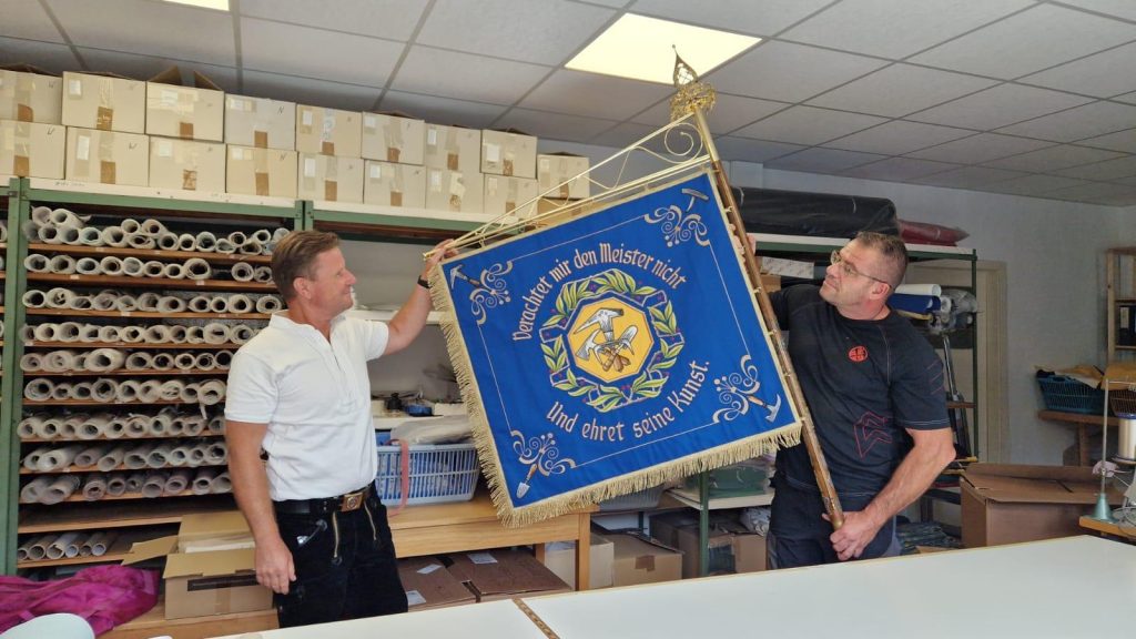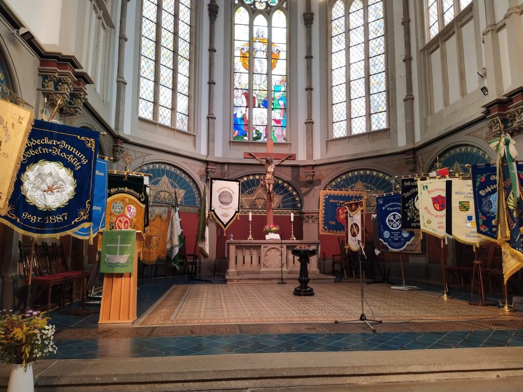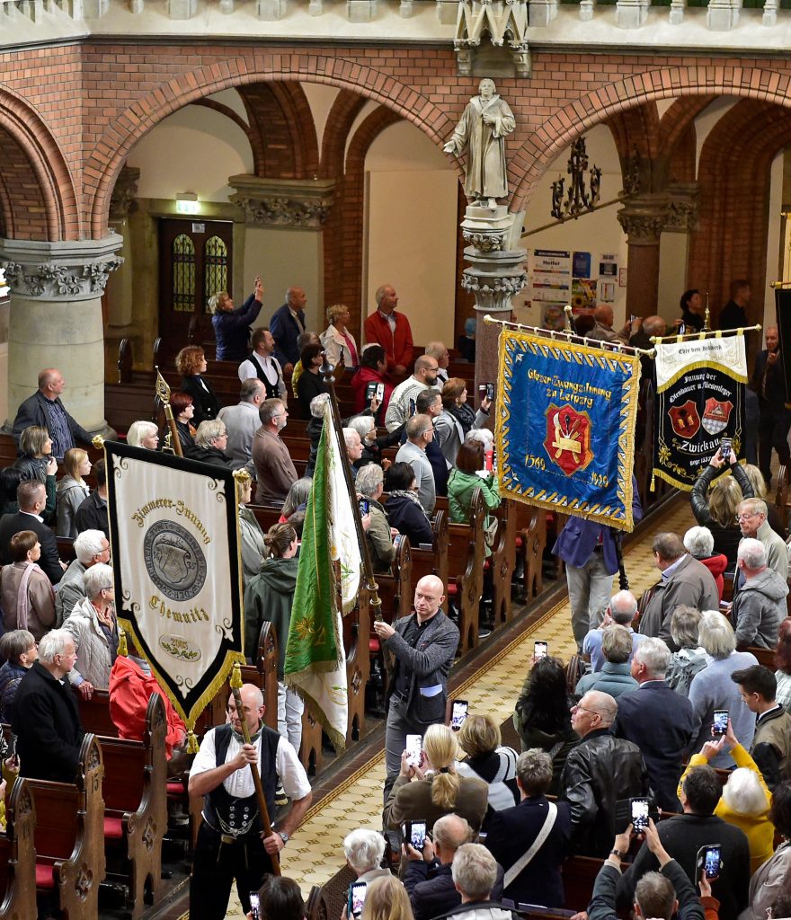 Rund 650 Gäste folgten der Einladung. Eindrucksvoll begann dann auch der Gottesdienst mit dem Einzug der Innungen und ihren Innungsfahnen. Superintendent Frank Manneschmidt begrüßte liturgisch und persönlich und lud alle Kinder zum Kindergottesdienst in den Chemnitz Hof ein. Hier wurde vor allem gesungen und gebastelt. Ein besonderes Ereignis war die anschließende Indienstnahme der neuen Fahne der Dachdecker-Innung, die mit dem Segenszuspruch des Landesbischofs Tobias Bilz, die nun die alte Innungsfahne ablöst.